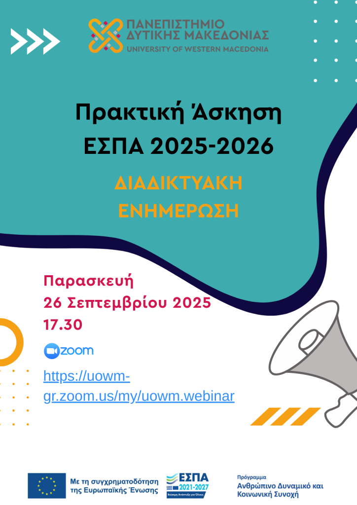 Η Επιστημονικά Υπεύθυνη της Πράξης «Πρακτική Άσκηση του Πανεπιστημίου Δυτικής Μακεδονίας ακαδ. ετών 2024-2027» κα Δόμνα Μιχαήλ και το Γραφείο Πρακτικής Άσκησης της Μονάδας Υποστήριξης Φοιτητών (ΜΥΦ), προσκαλούν τους φοιτητές και τις φοιτήτριες, καθώς και τους/τις Τμηματικά Υπεύθυνους/ες Πρακτικής Άσκησης όλων των Τμημάτων του Πανεπιστημίου Δυτικής Μακεδονίας στην Διαδικτυακή Ενημέρωση για την Πρακτική Άσκηση ΕΣΠΑ 2025-2026, η οποία θα πραγματοποιηθεί: