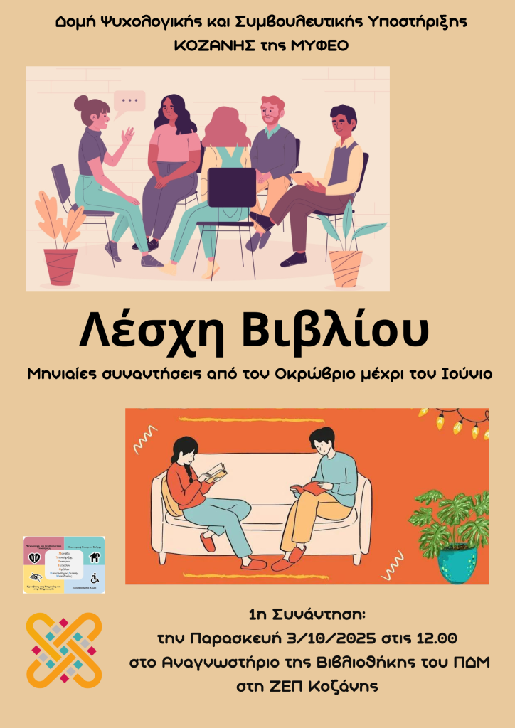 «Στο πλαίσιο λειτουργίας της Δομής Ψυχολογικής και Συμβουλευτικής Υποστήριξης (ΔΟ.ΨΥ.Σ.Υ.) της Μονάδας Υποστήριξης Φοιτητών Ευπαθών Ομάδων (ΜΥΦΕΟ) του Πανεπιστημίου Δυτικής Μακεδονίας (Π.Δ.Μ.), η οποία χρηματοδοτείται από το Έργο «Ψυχολογική και Συμβουλευτική Υποστήριξη Ανθρώπινου Δυναμικού ΠΔΜ (κωδ. rescom: 81081)», ανακοινώνουμε τη διοργάνωση Λέσχης Βιβλίου. Πρόκειται για μια ομάδα, η οποία απευθύνεται τόσο σε φοιτητές/τριες τμημάτων του Π.Δ.Μ. που εδράζονται στην Κοζάνη, όσο και σε άτομα που εργάζονται στο Πανεπιστήμιο στην πόλη της Κοζάνης. Οι συναντήσεις της ομάδας θα πραγματοποιούνται μια φορά τον μήνα καθ’όλη τη διάρκεια της ακαδημαϊκής χρονιάς και στόχο θα έχουν τη συζήτηση και την ανταλλαγή απόψεων γύρω από ένα συγκεκριμένο κάθε φορά βιβλίο.